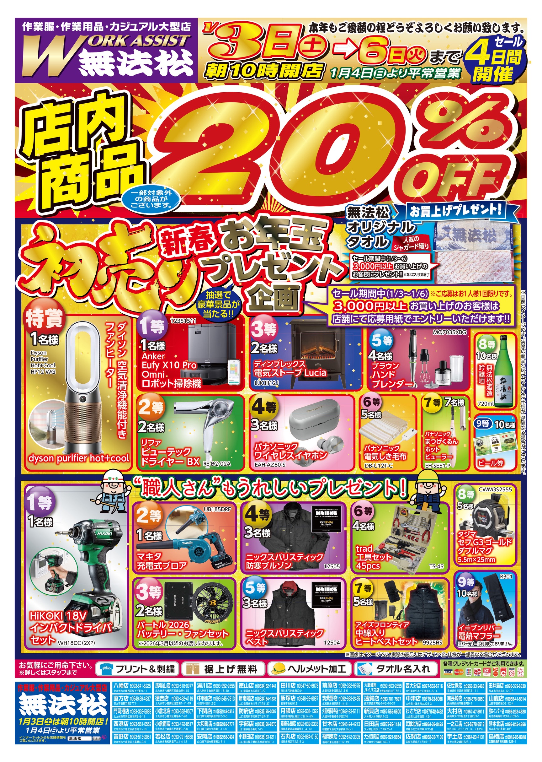 1月3日(土)〜6日(火)の4日間、店内商品が20% OFF(一部商品除外)となります。セール期間中、3,000円以上お買い上げのお客様にはプレゼントをご用意しております。(なくなり次第終了)超目玉商品をご用意しておりますので、ご来店お待ちしております